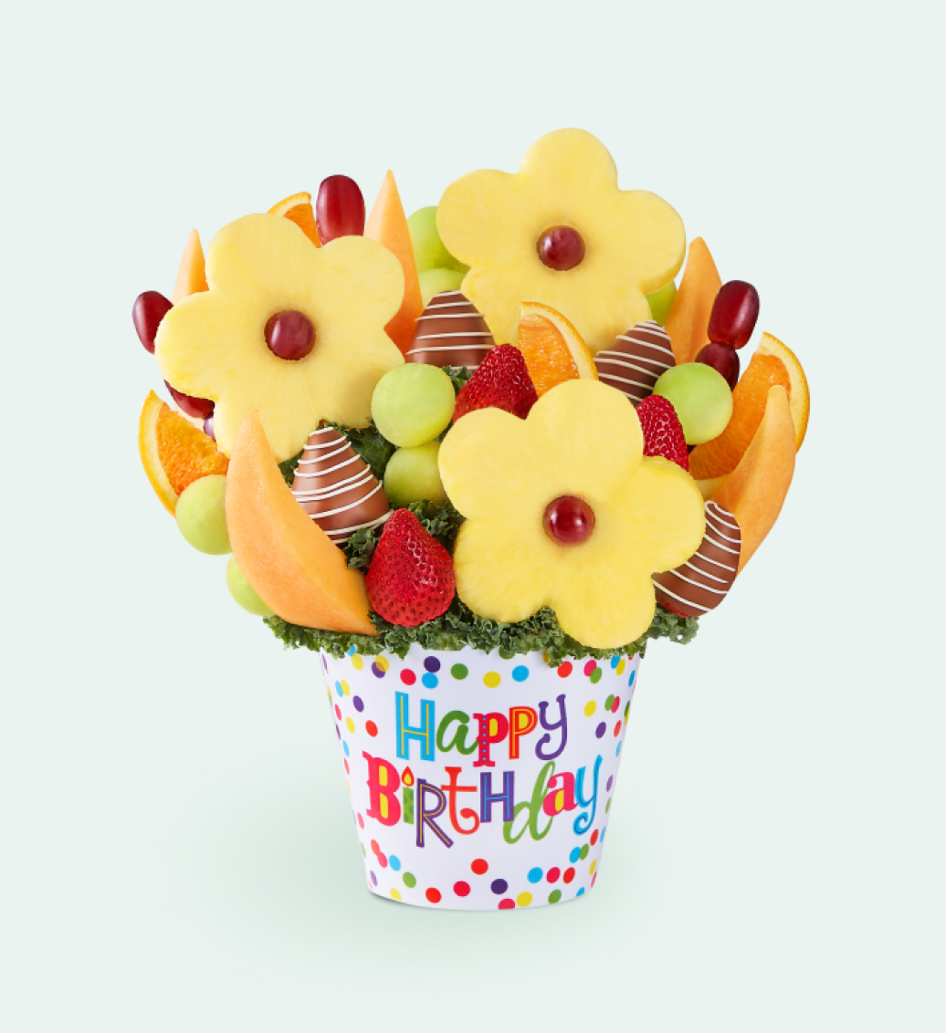FruitBouquets.com offers a delicious assortment of fresh fruit arrangements, chocolate dipped fruits and more tasty gifts delivered! Each fruit arrangement is hand crafted with the utmost of care and with the freshest fruit to deliver a 100% smile guarantee. Our talented designers have been trained to make sure each fruit arrangement looks and tastes good enough to eat! Get gift ideas for the entire family from fruit arrangements for mom & dad to chocolate covered strawberries for siblings. Whether you're looking for birthday fruit arrangements or to send a gift just because, we offer the perfect fruit gifts for delivery for all occasions.