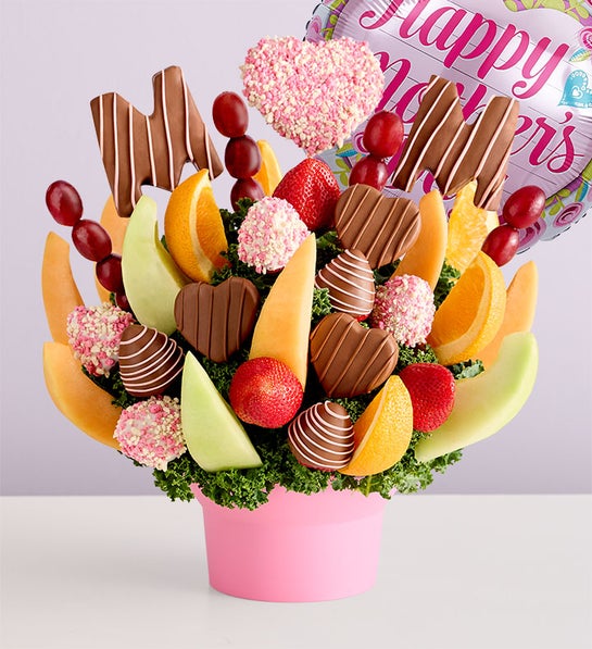 Celebrate the best in the bunch: Mom! Our sweet fruit arrangement is filled with dipped and drizzled pineapple hearts and decadent strawberries along with dipped pineapples that spell out “M-O-M” with a delightful heart-shape “O.” We’ve served it up in a pretty pink bowl for the perfect Mother’s Day surprise. Add a balloon to make it extra special.