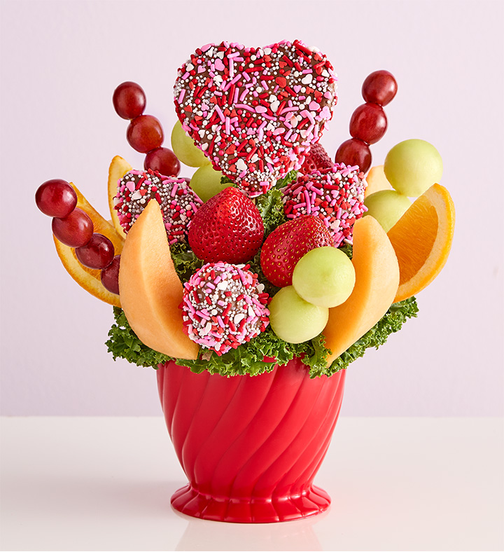 Love, sweet, love. Our luscious arrangement is filled with plump strawberries, melon, and more juicy favorites, with a heart-shape pineapple at the center. The small version features all undipped fruit; in the large version, the pineapple and some strawberries are dipped in milk chocolaty confection and covered in sprinkles.