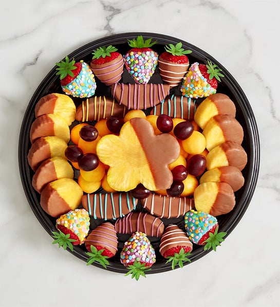 Make every springtime celebration sweeter with our festive fruit platter. A generous selection of juicy pineapples, strawberries, and apple wedges dipped, drizzled, and sprinkled in pastel colors, plump melon, and more is perfectly plated on a round platter, ready to serve up and share.