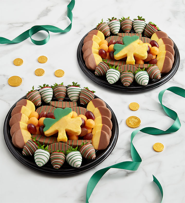 This fanciful fruit-filled platter is the perfect addition to any St. Patrick’s Day celebration. Chocolate-dipped strawberries and apple wedges, melon balls, grapes, and more bring color and sweetness, and the 12” platters add a shamrock-shape pineapple slice half-dipped in chocolate for more fun.