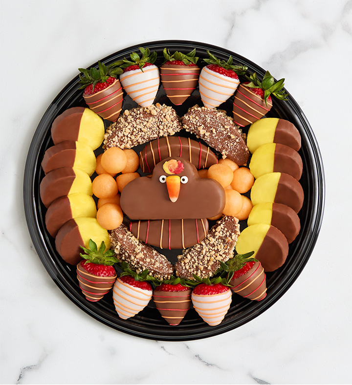 NEW Kids and grown-ups alike will be eager to gobble up these sweet and juicy delights during the Thanksgiving festivities. Pineapple slices, strawberries, and apple wedges are dipped in chocolaty goodness and decorated with toffee, with drizzle, or to resemble the cutest-ever turkeys. Available in three sizes, this platter will make any gathering unforgettable.